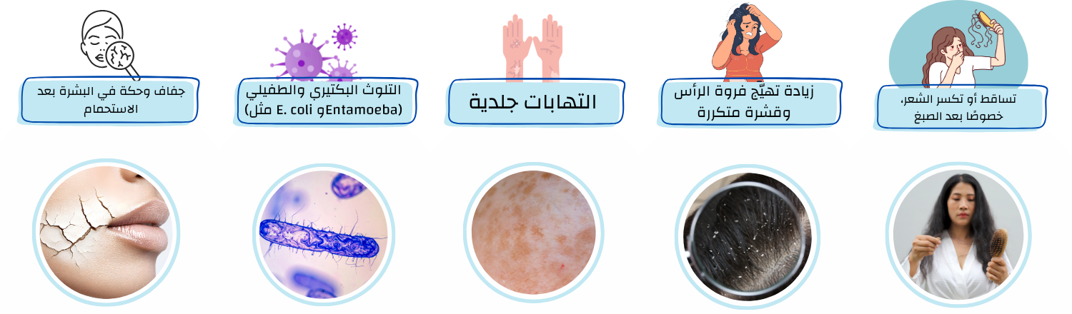 ماء الدش العادي يحتوي على كلور، معدن مثل الصدأ، وملوثات تزيد من جفاف البشرة وتضعف الشعر. التعرض اليومي لهذه المواد يجعل الجلد يفقد زيوته الطبيعية ويجعل الشعر باهتًا