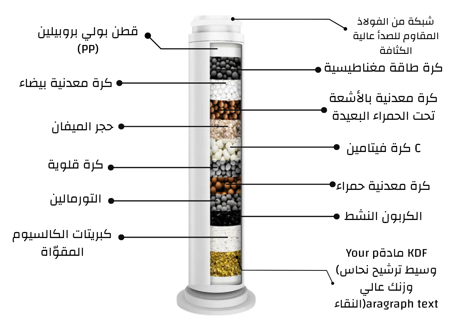 يحتوي الفلتر على كرات فيتامين سي التي تساعد في تنعيم البشرة وتقوية الشعر، إضافةً إلى كرات معدنية منشّطة وطبقات كربون فعّالة تزيل الكلور والرواسب والروائح غير المرغوبة