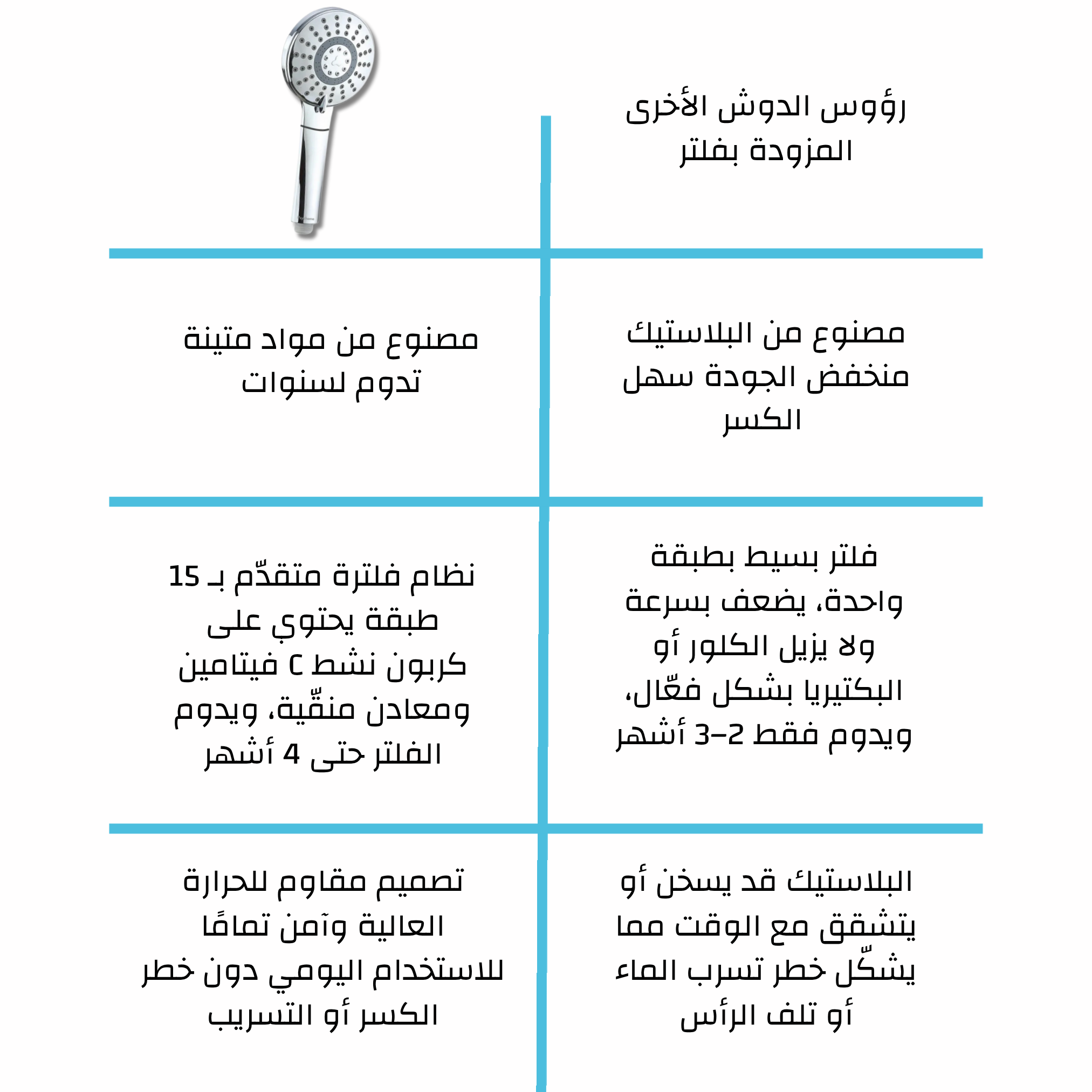 رأس الدشّ الخاص بنا يدوم حتى 4 أشهر قبل الحاجة لتبديل الفلتر، بينما أغلب رؤوس الدش الأخرى لا تتجاوز 2 إلى 3 أشهر. كما أنه مصنوع من مواد قوية تتحمّل الحرارة العالية دون أن تذوب أو تتشوّه، بعكس الرؤوس الرخيصة المصنوعة من بلاستيك ضعيف يتلف بسرعة. تصميمه المتين يضمن استخداماً طويلاً وتجربة استحمام مريحة ونظيفة كل مرة